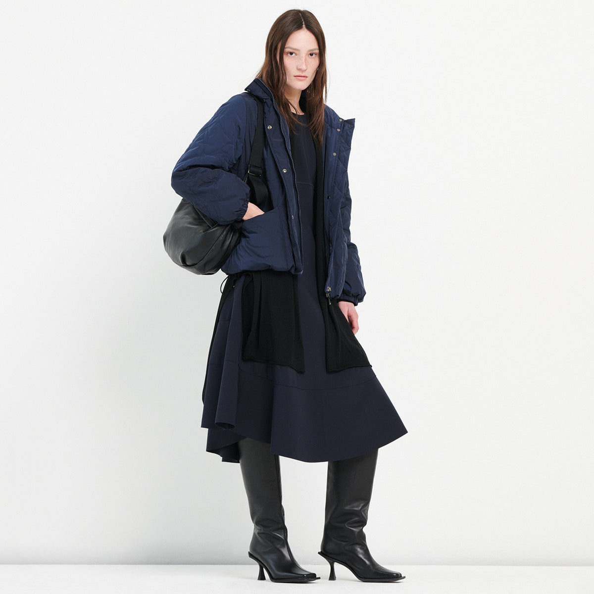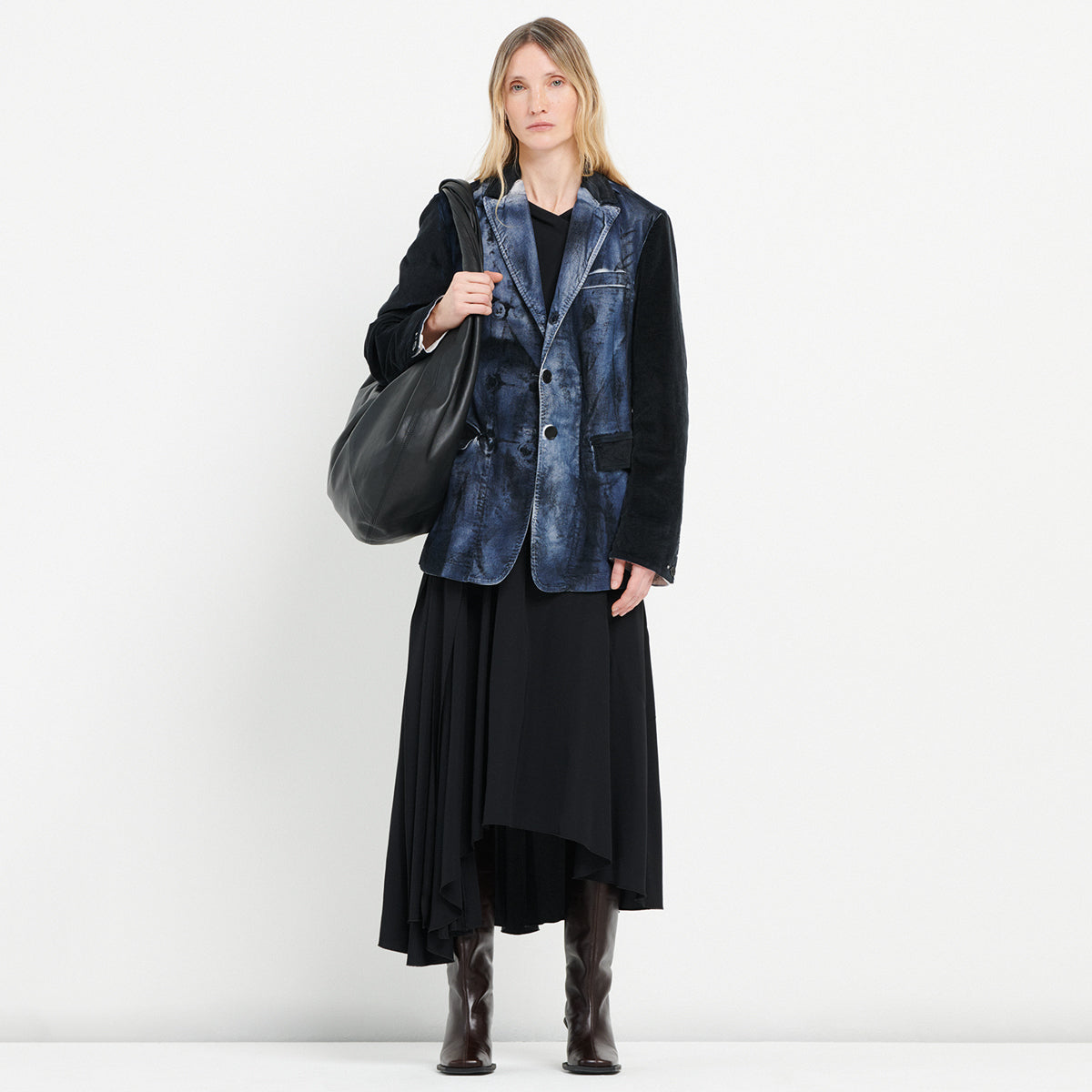 Die Jacke Tommy interpretiert die klassische Bikerjacke neu - mit einer strukturierten doppelreihigen Form, applizierten Mikro-Nieten und mehreren Reissverschlussen. Der Metallschnallen-Gurtel betont eine feminine und markante Silhouette.